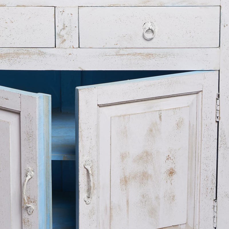 La finitura è tipicamente shabby con l’effetto di sabbiatura distribuito in modo ottimale su tutta la superficie sopra il colore base bianco.