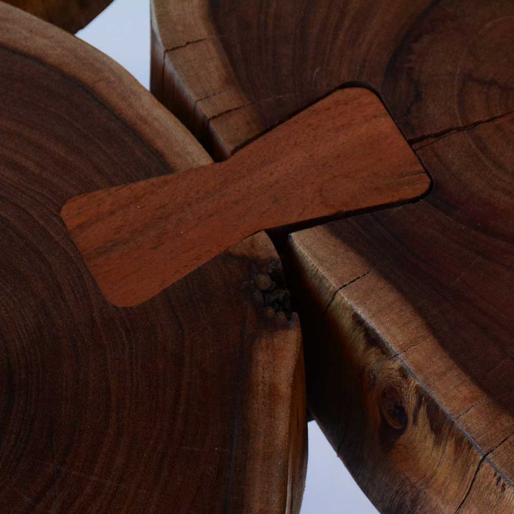 Ecco il tavolino a quadrifoglio realizzato da mani artigiane esperte con sezioni di tronco d’albero.