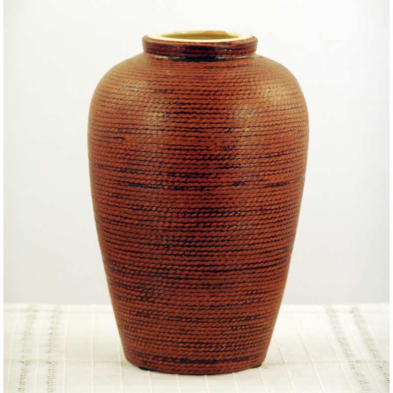 Vaso in ceramica con effetto corda sabbiato di colore bruno. Di dimensioni abbastanza ridotte, trova posto ovunque serva un complemento d’arredo per nobilitare angoli spenti.