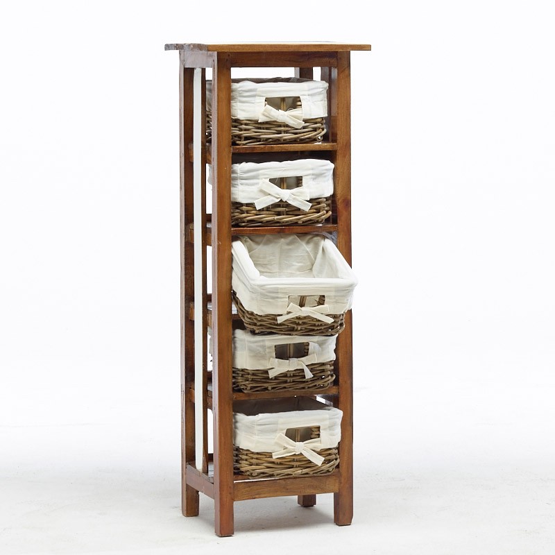 Cassettiera country in legno massello con cinque cestini in rattan foderati con fiocco. Tutta in legno color naturale e con splendide venature.