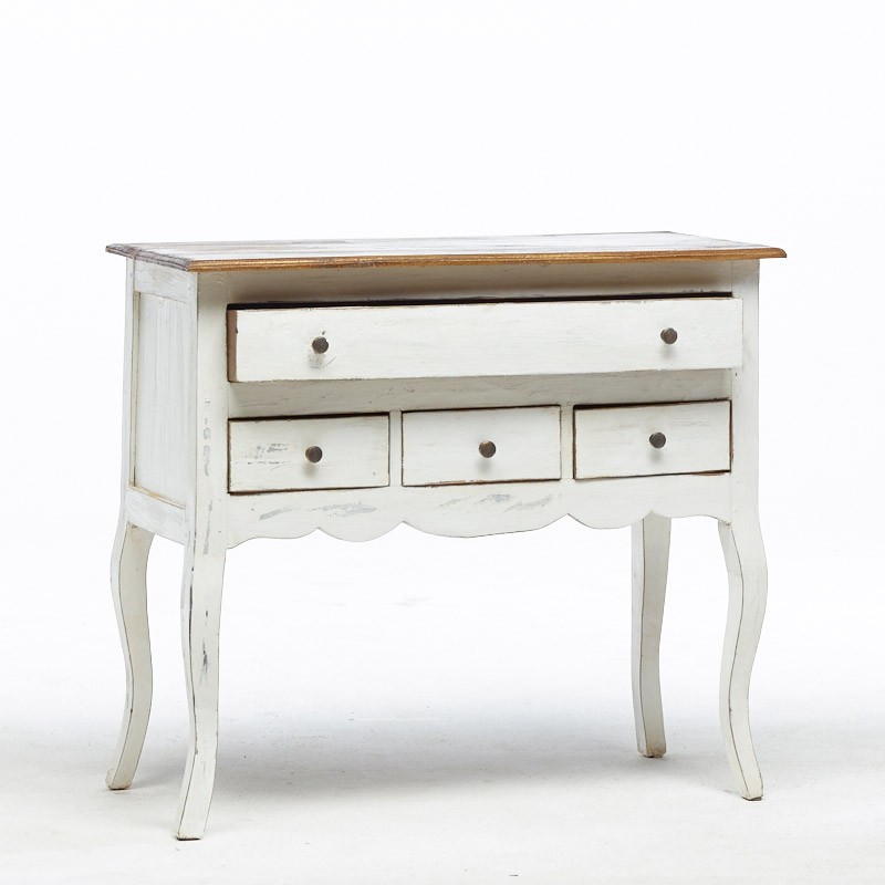Comò shabby chic in stile francese con gambe mosse. Finito in bianco a pennello con effetto rustico e con piano superiore non verniciato. Mette in evidenza la bellezza del legno e delle venature.
