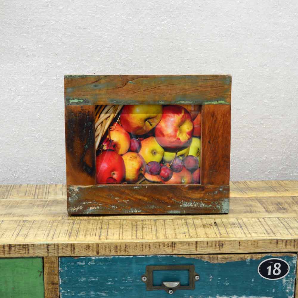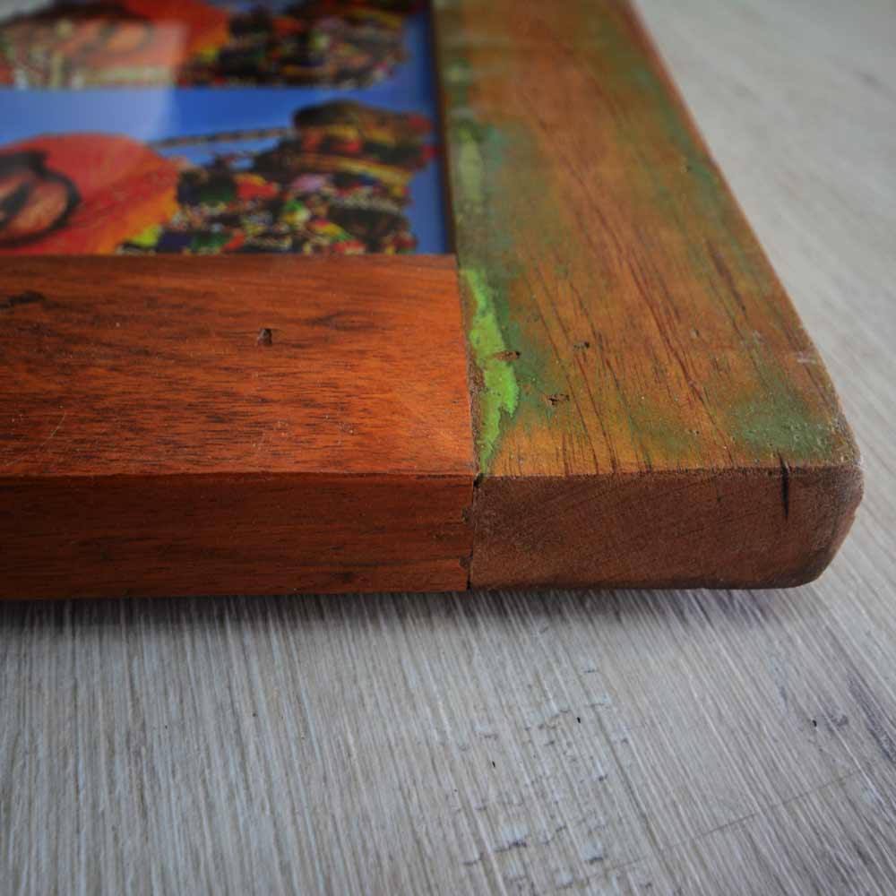 Una cornice in legno di recupero, legno vero, tutto massello di alto spessore di circa 3 cm, creata a mano come si faceva una volta mettendo assieme legni di diverse dimensioni, venature e sfumature per poi fissarli assieme con incastri perfetti. E’ un prodotto di pregio, ogni cornice è diversa dall’altra: sono tutti pezzi unici.