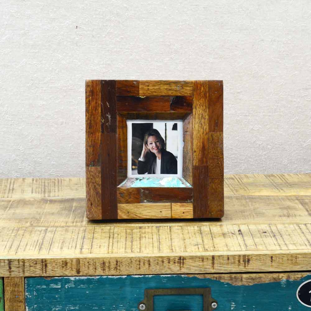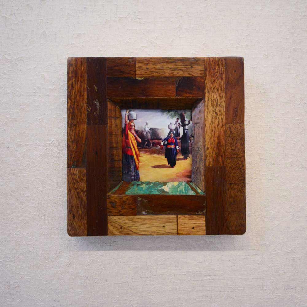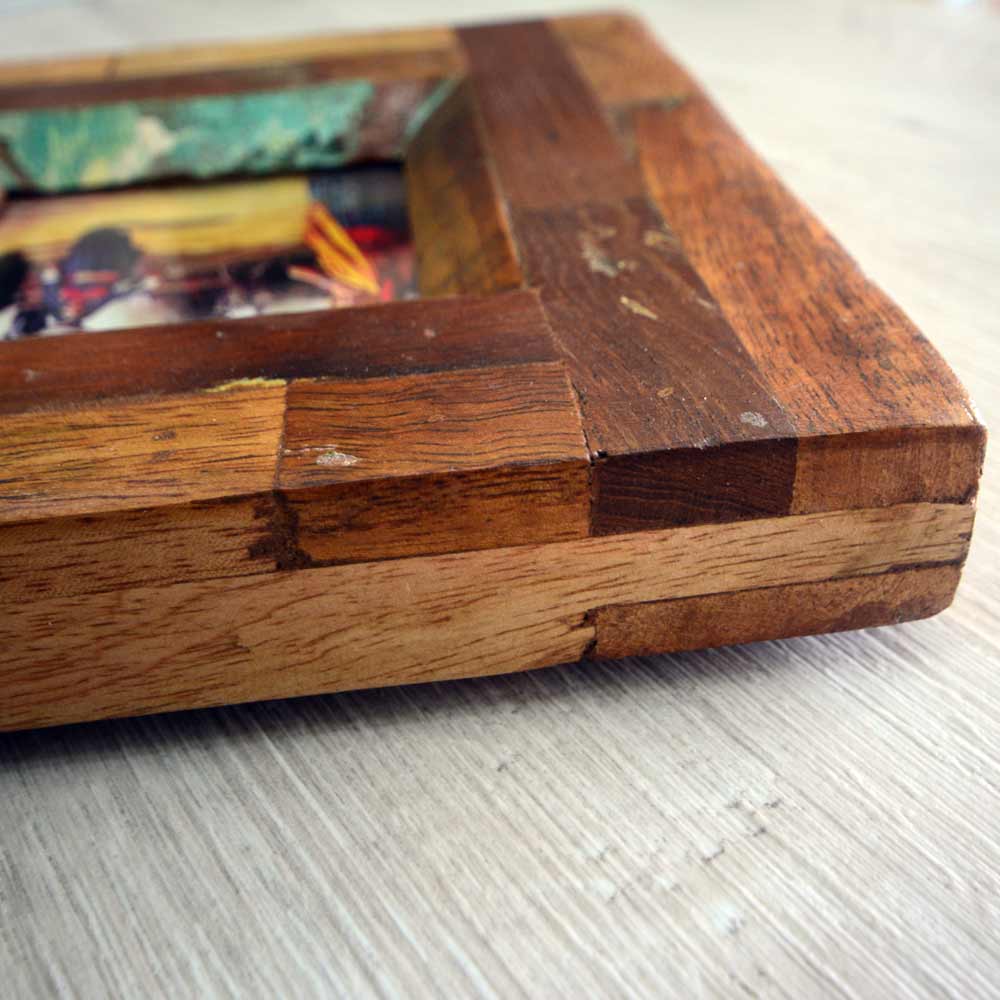 Una cornice in legno di recupero, legno vero, tutto massello di alto spessore di circa 3 cm, creata a mano come si faceva una volta mettendo assieme legni di diverse dimensioni, venature e sfumature per poi fissarli assieme con incastri perfetti. E’ un prodotto di pregio, ogni cornice è diversa dall’altra: sono tutti pezzi unici.