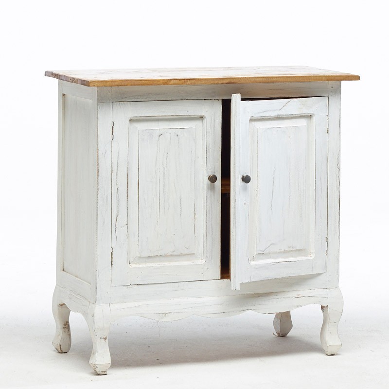 Credenza stile francese con finitura shabby chic colore bianco tranne il top che è mantenuto appositamente non verniciato per creare contrasto di colore e per evidenziare il bel legno naturale.