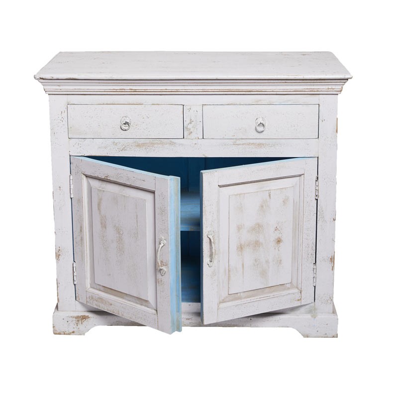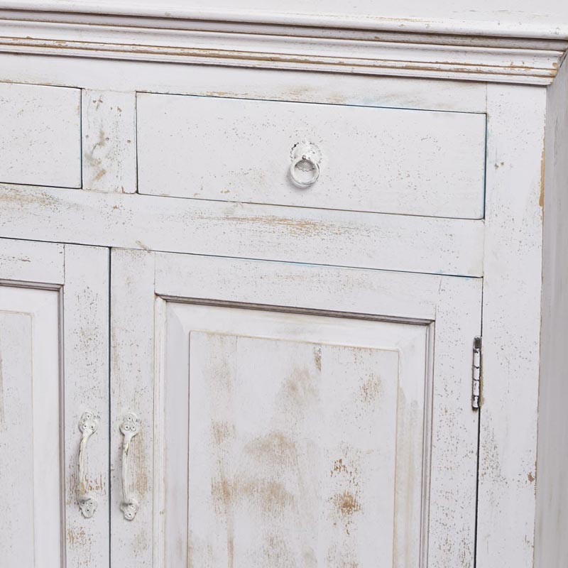 Mobile shabby chic molto versatile e adatto a svariati ambienti. Ha misure ottimali per ospitare un sacco di cose della sala o della cucina con due ante che chiudono un volume generoso anche per oggetti ingombranti. Ha anche due cassetti profondi e spaziosi.