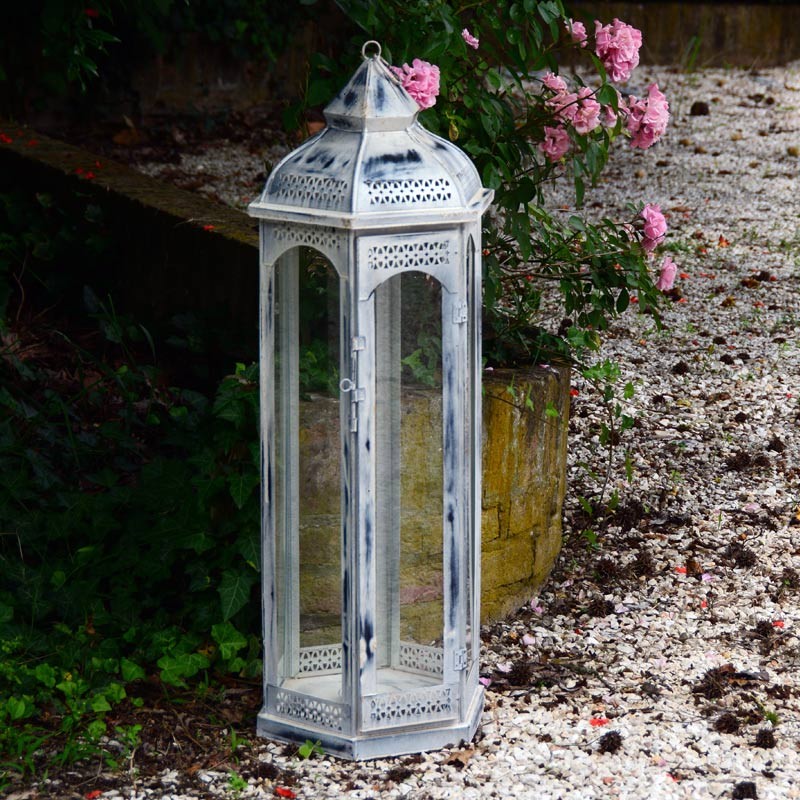 Una lanterna in metallo alta quasi 90 cm, per candele. Complemento d’arredo a base esagonale. Disegno classico e orientaleggiante assieme, è verniciata e decapata con un effetto shabby chic molto evidente e con tracce di trattamento antichizzante.