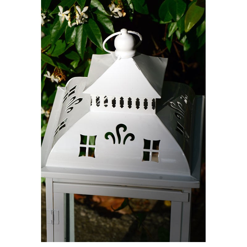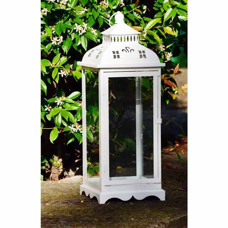 Una lanterna da interno e da esterno per candele, di grande dimensione, finita con verniciatura a smalto lucida senza decapature.