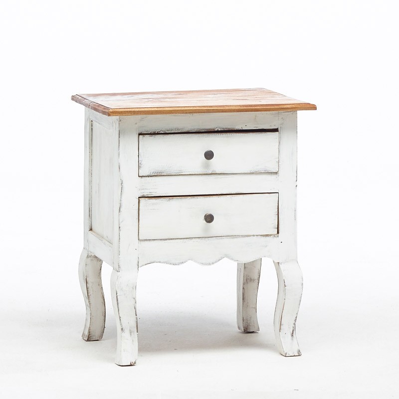 Piccolo mobile shabby chic a due cassetti, colore bianco con piano in legno naturale non verniciato.