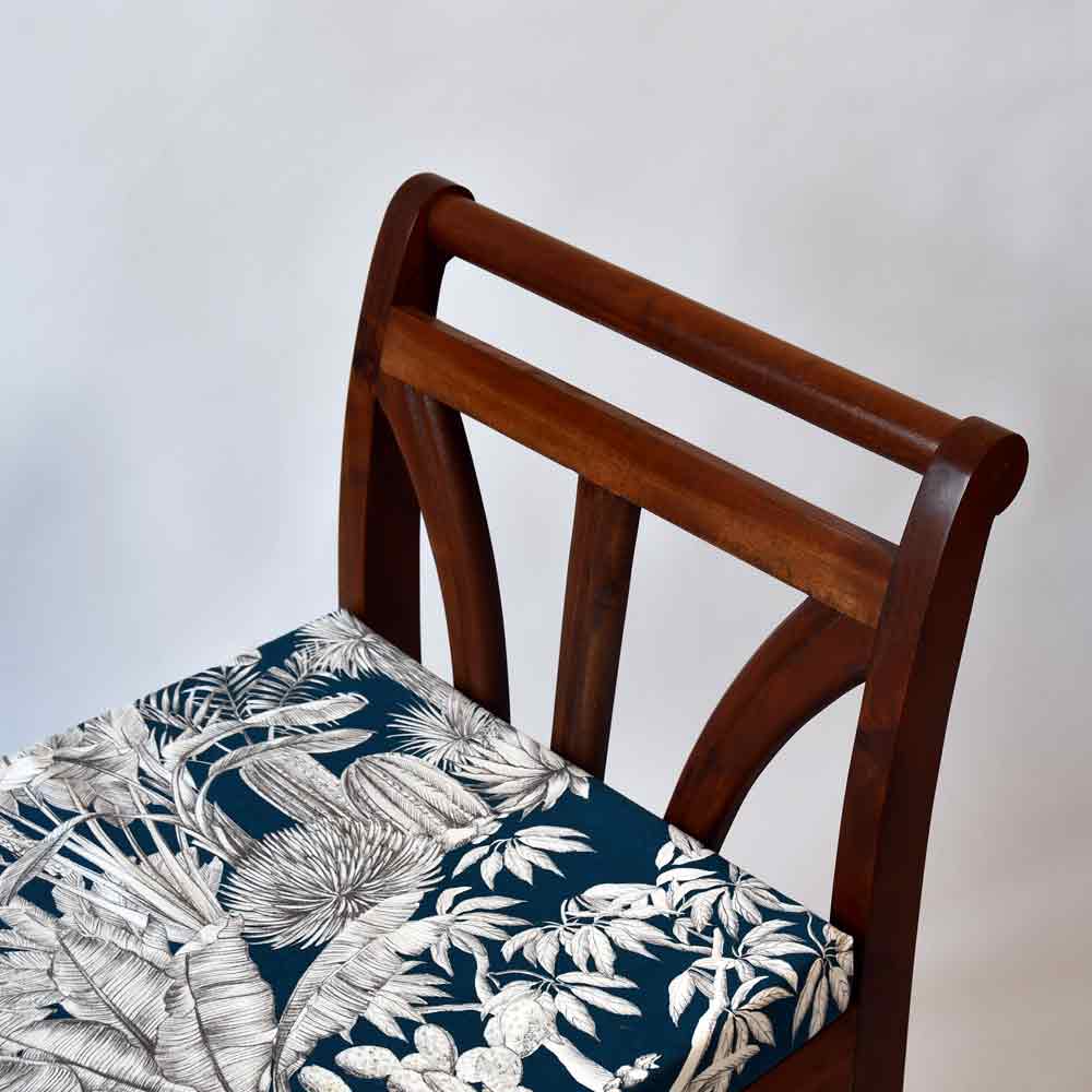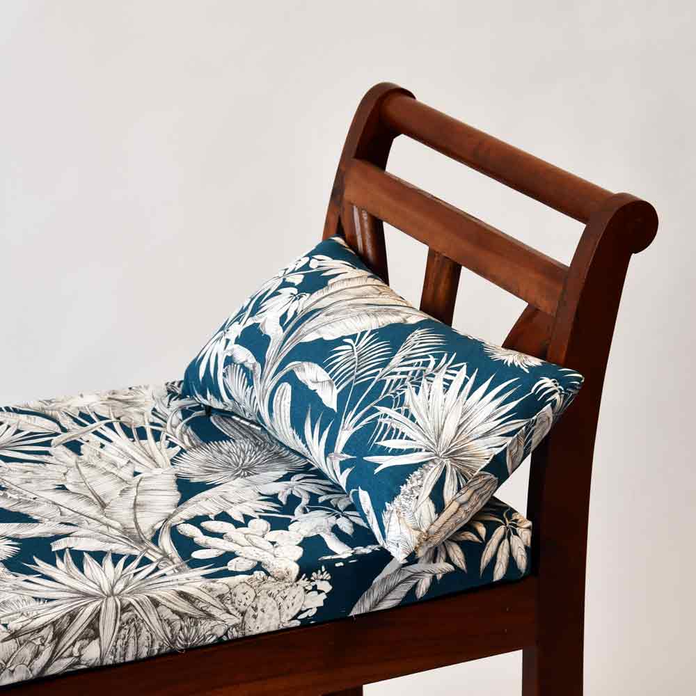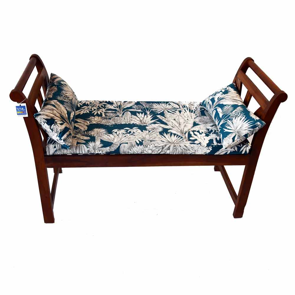 E’ un arredo di grande classe, con il legno in bella evidenza verniciato in opaco che contrasta splendidamente con i colori bianco e azzurro-verde dei cuscini.