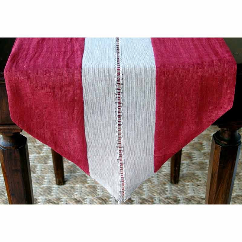 Tessuto in lino di colore rosso vinaccia vivo con motivo centrale in tinta naturale e ricamo simile orlo giorno.