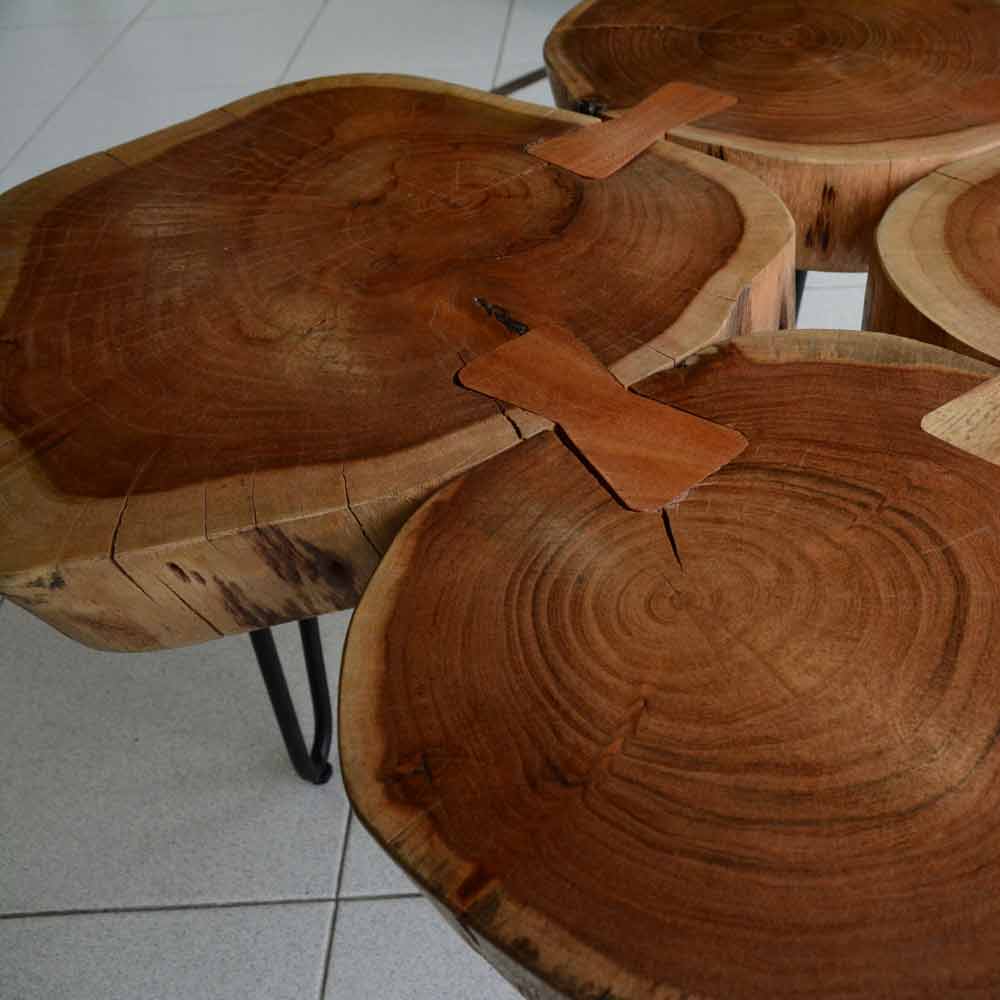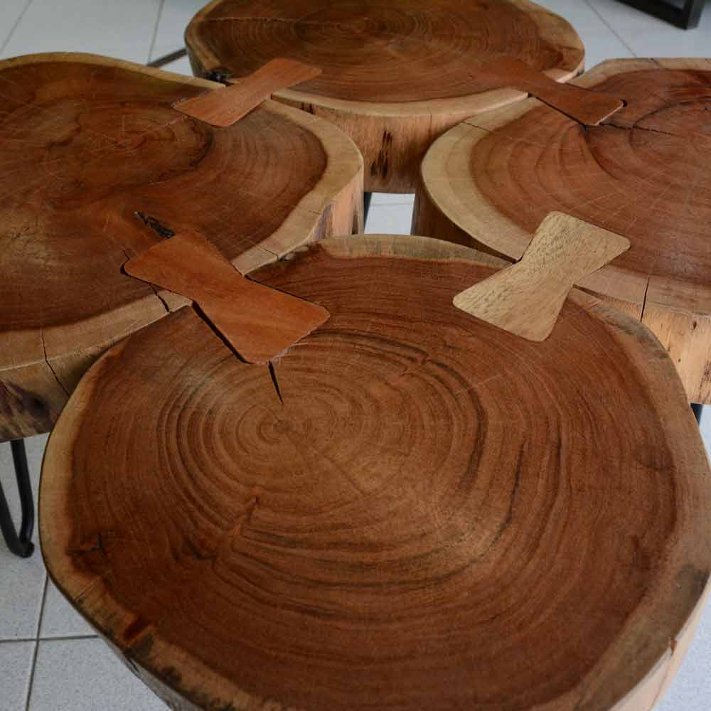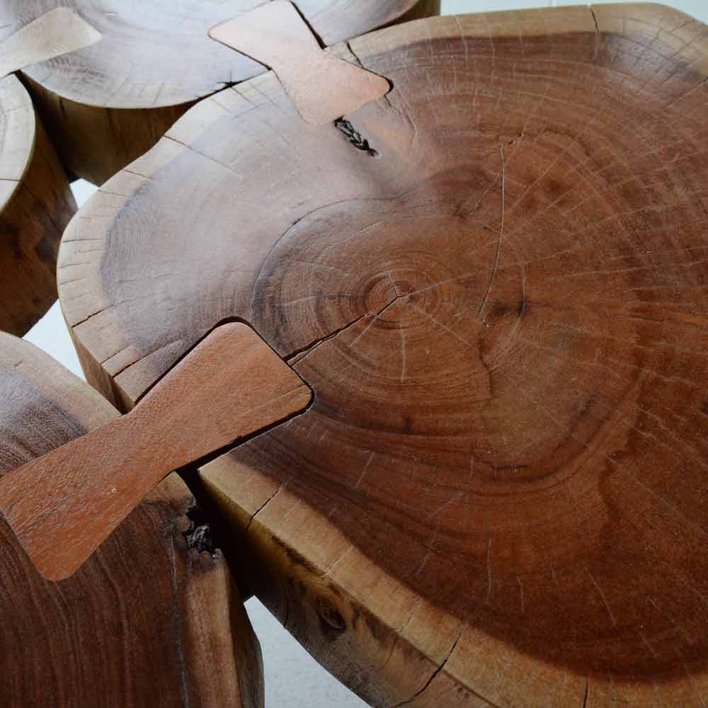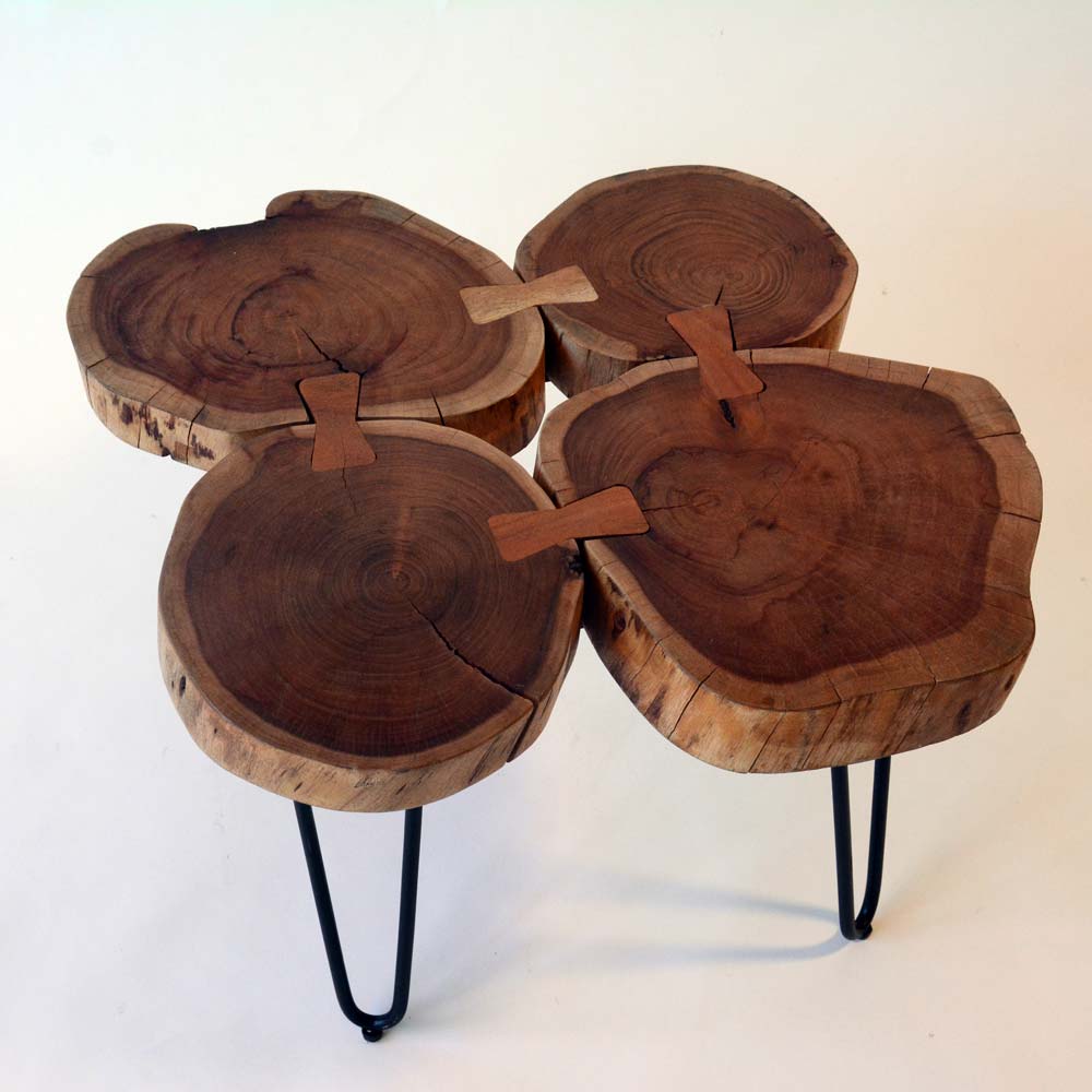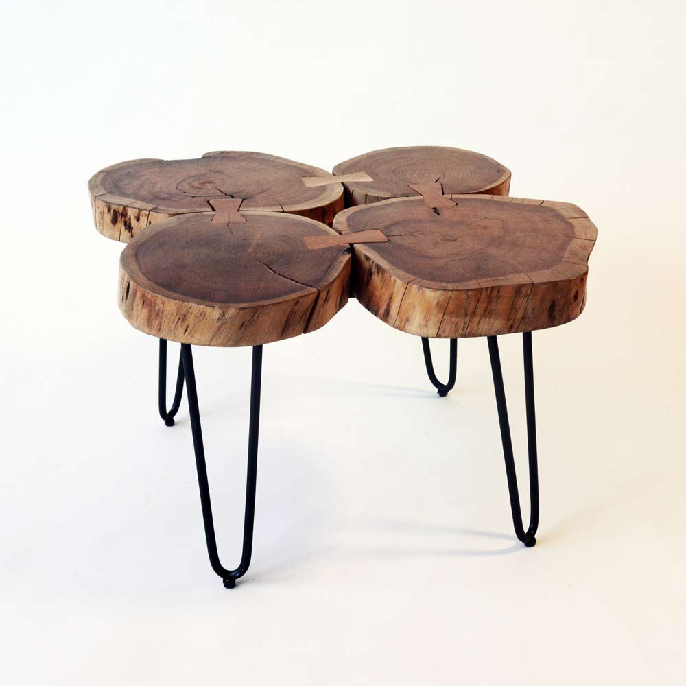 Ecco il tavolino a quadrifoglio realizzato da mani artigiane esperte con sezioni di tronco d’albero.