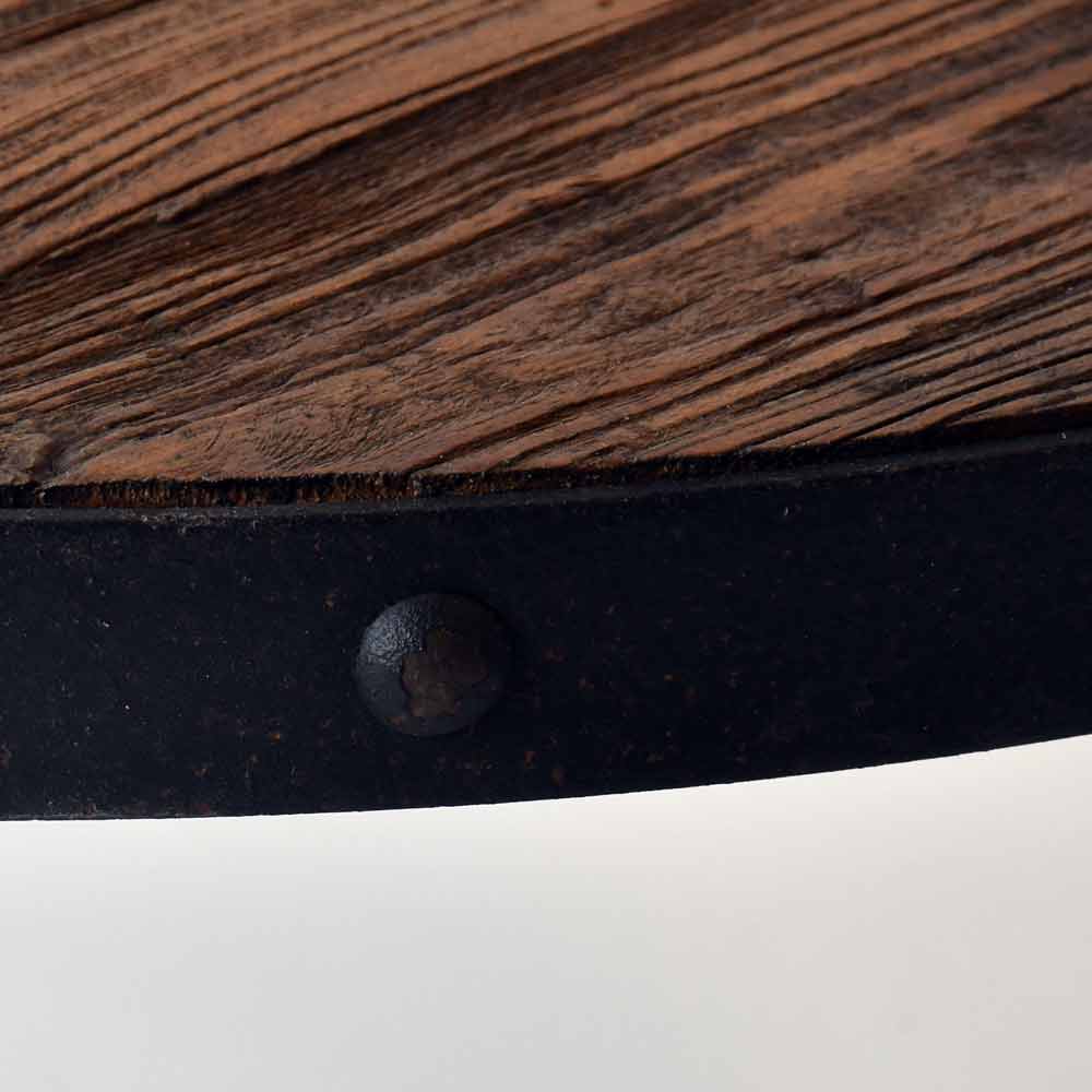 E’ realizzato da mani artigiane in vero legno in assi tagliate, assemblate e unite assieme da una circonferenza in cerchiatura di ferro anticato e borchie sempre in ferro. Come fosse una botte!