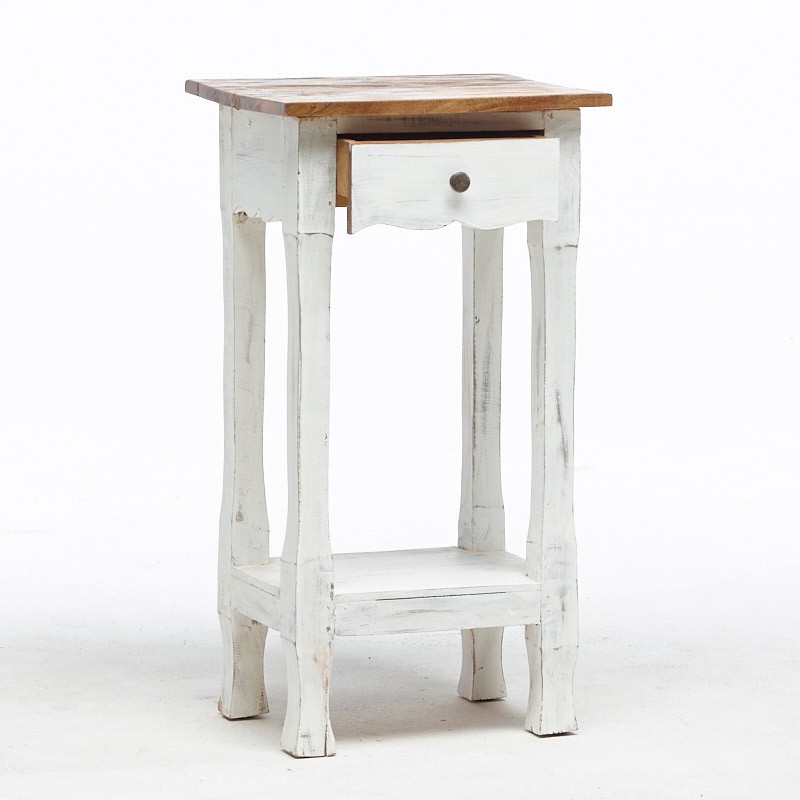 Tavolino shabby chic bianco con piano in legno a vista non verniciato.