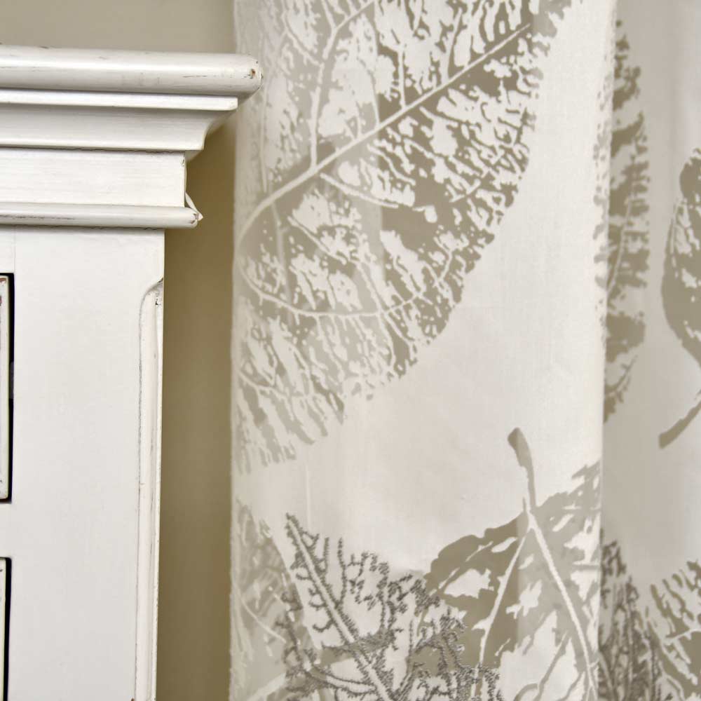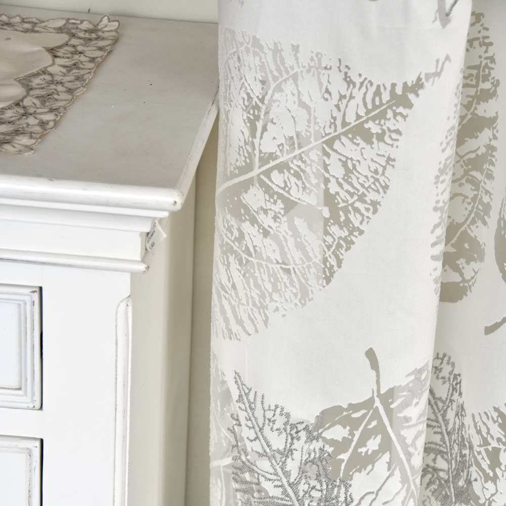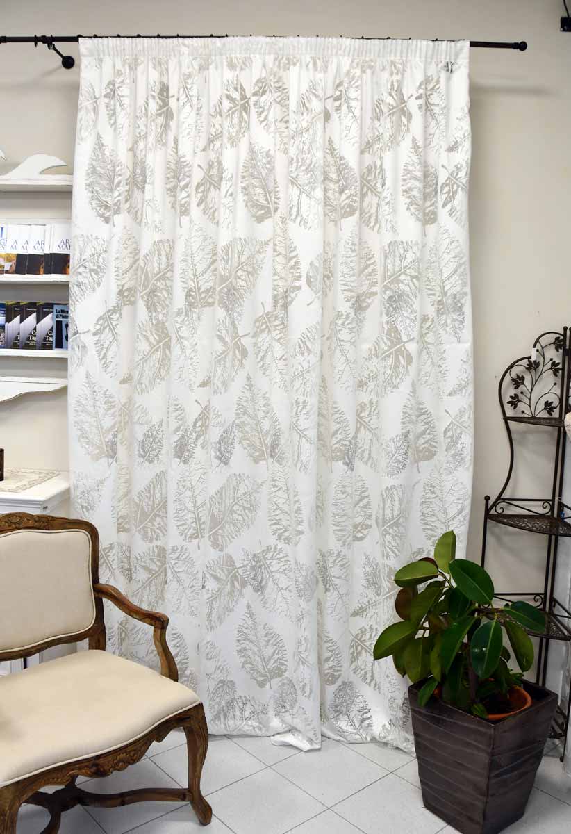 E’ realizzata in tessuto devorè con un disegno a foglie grandi. Alcune di queste sono ricamate con un filo lucido di colore grigio che crea uno straordinario effetto di contrasto ma estremamente delicato e piacevole.