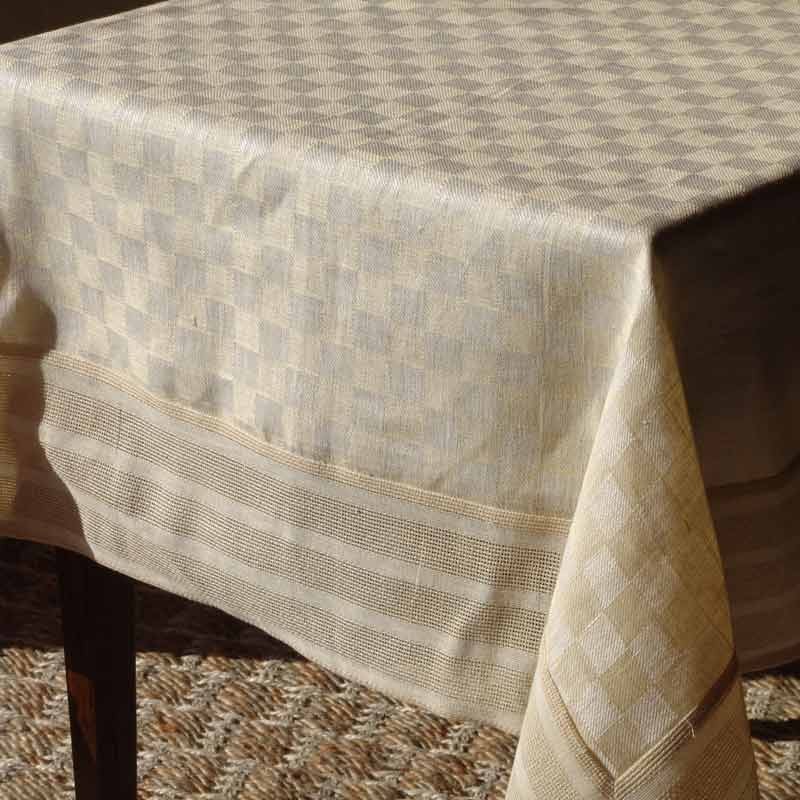 Creata in tessuto li lino color giallo paglia con fantasia a scacchi jaquard e corredata di un fine bordo nello stesso colore.