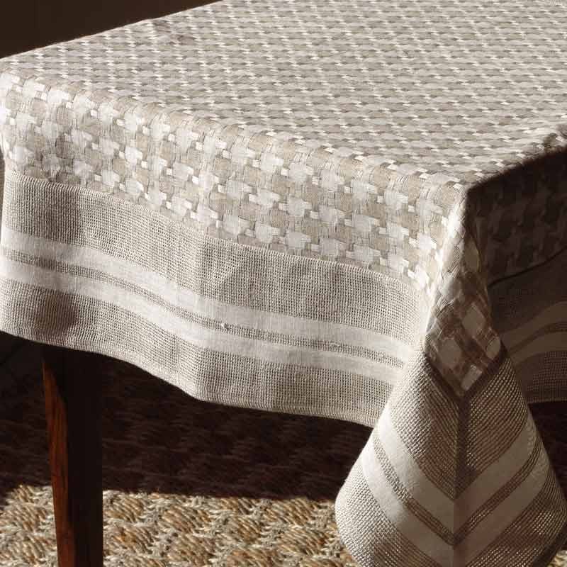 Creata in tessuto in lino bicolore bianco e color lino naturale con una fantasia a motivi contrastanti intrecciati e corredata di un elegante bordo bianco e naturale. Una tovaglia che donerà classe a ogni ambiente con un tocco di calore.