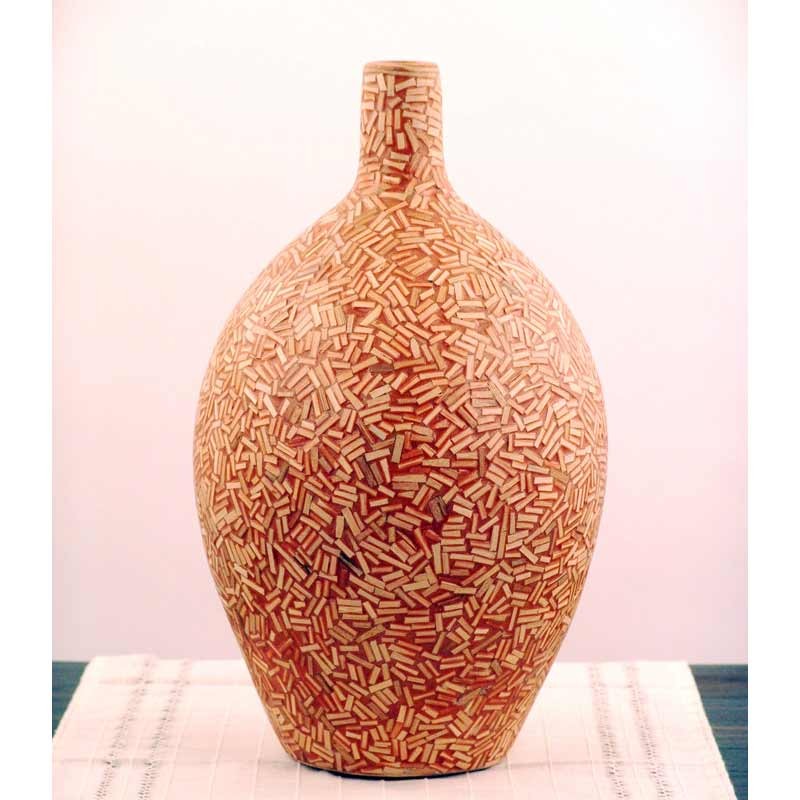Vaso in ceramica con originale finitura a pezzetti di bambù su tutta la supeficie visibile. Il colore è bruno chiaro ottenuto dal risalto della base color miele con il bambù.