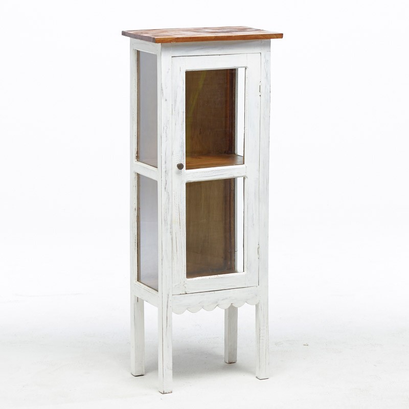 Ampia anta frontale in legno e vetro e vetrature sui due laterali. Stile raffinato e rustico assieme per un mobile molto grazioso verniciato in bianco con finitura tipo shabby.